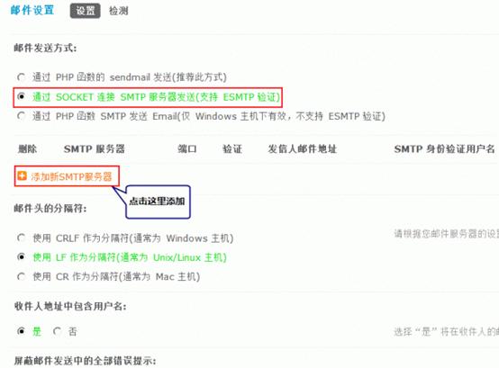 2、站点创始人登录 Discuz! 的后台 => 站长 => 邮件设置,选择“通过 SOCKET 连接 SMTP 服务器发送(支持 ESMTP 验证)”如下图所示: