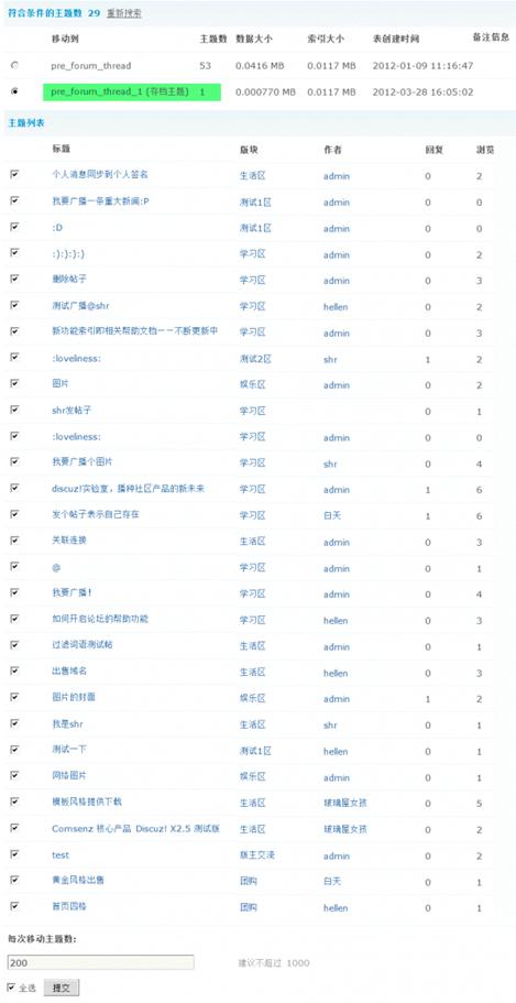 主题移动功能可将特定的主题在原始表(forum_thread)和新建的主题存档表之间移动。移动主题之前,请确定存在至少一个主题存档表(表名为 forum_thread_1、forum_thread_2……)。
