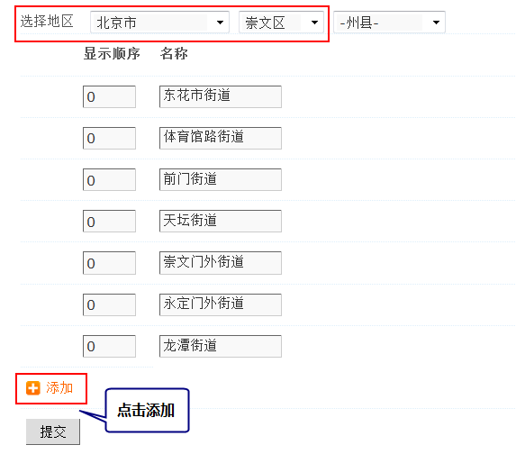如上图所示,可以在北京市崇文区下添加所属街道。