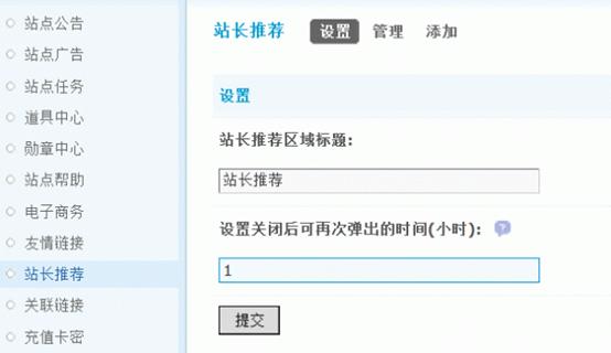 此处可以更改站长推荐区域使用的标题以及设置关闭后可再次弹出的时间。
