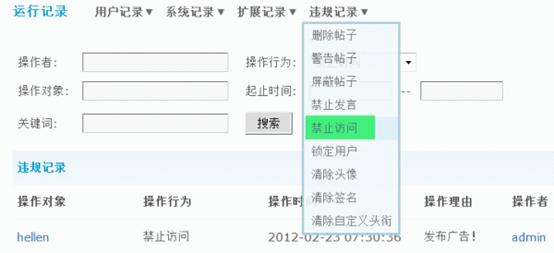 记录系统中的一些违规操作,包括:删除帖子、警告帖子、屏蔽帖子、禁止发言、禁止访问、锁定用户、清除头像、清除签名和清除自定义头衔。