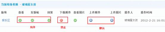 用户在版块中的权限是基于用户和站点间的权限设定,如果设置为非默认状态,将不受用户组的设定限制。